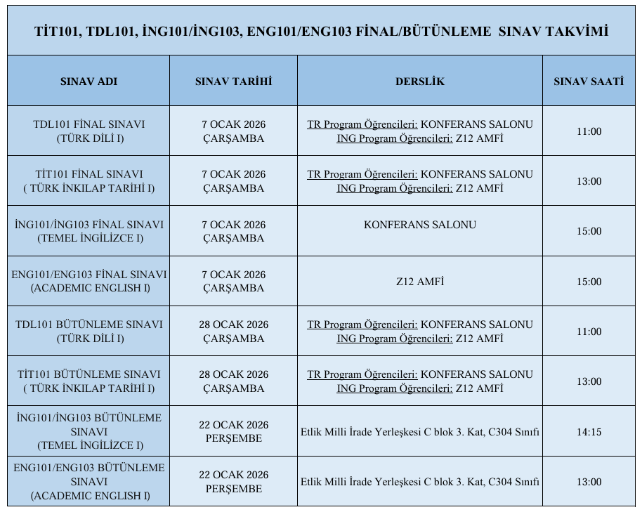 TİT101, TDL101, İNG101/İNG103, ENG101/ENG103 FİNAL VE BÜTÜNLEME SINAV TAKVİMİ