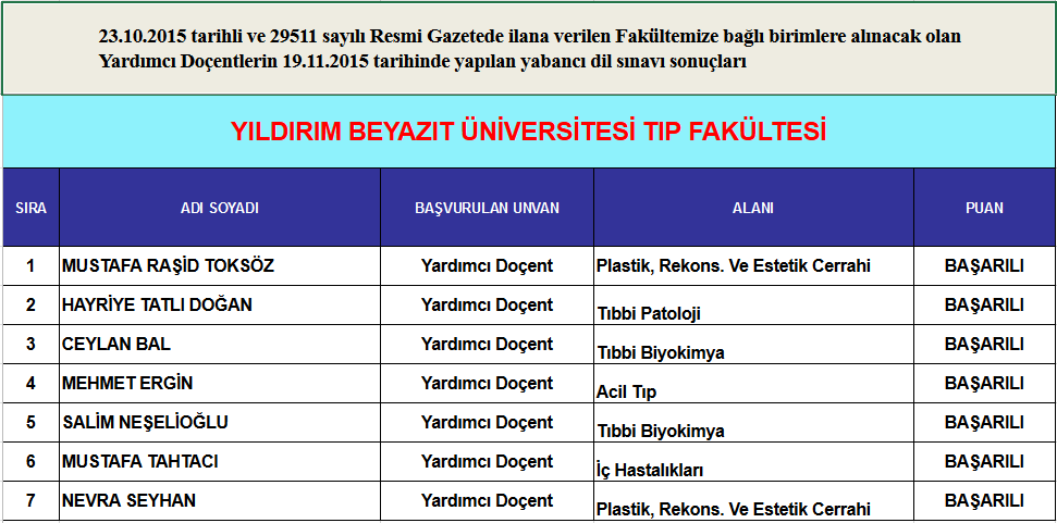 Yardımcı Doçent Dil Sınavı Sonuçları (19.11.2015)