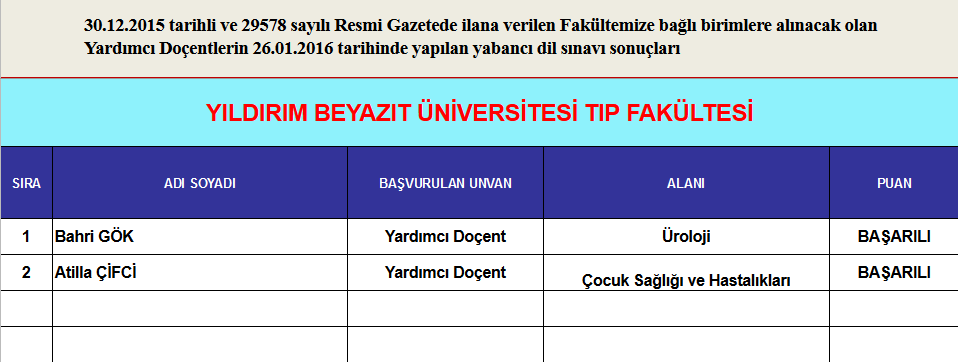 Yardımcı Doçent Dil Sınavı Sonuçları (26.01.2016)