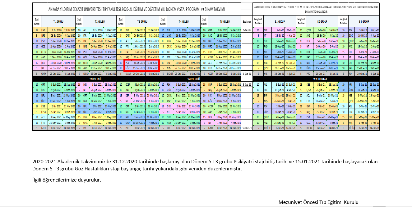 Dönem 5 T3 Grubu Staj Takviminde Değişiklik Duyurusu (11-01-2021)