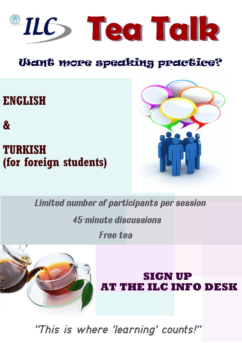 Let’s Talk is a perfect speaking activity for those who are looking for individualized practice opportunities. Learners may find the booking list at the entrance of the ILC, pick a suitable time slot and write a topic they would be willing to talk about with an ILC teacher. Foreign students seeking focussed Turkish speaking practice are also welcome to book a time slot.