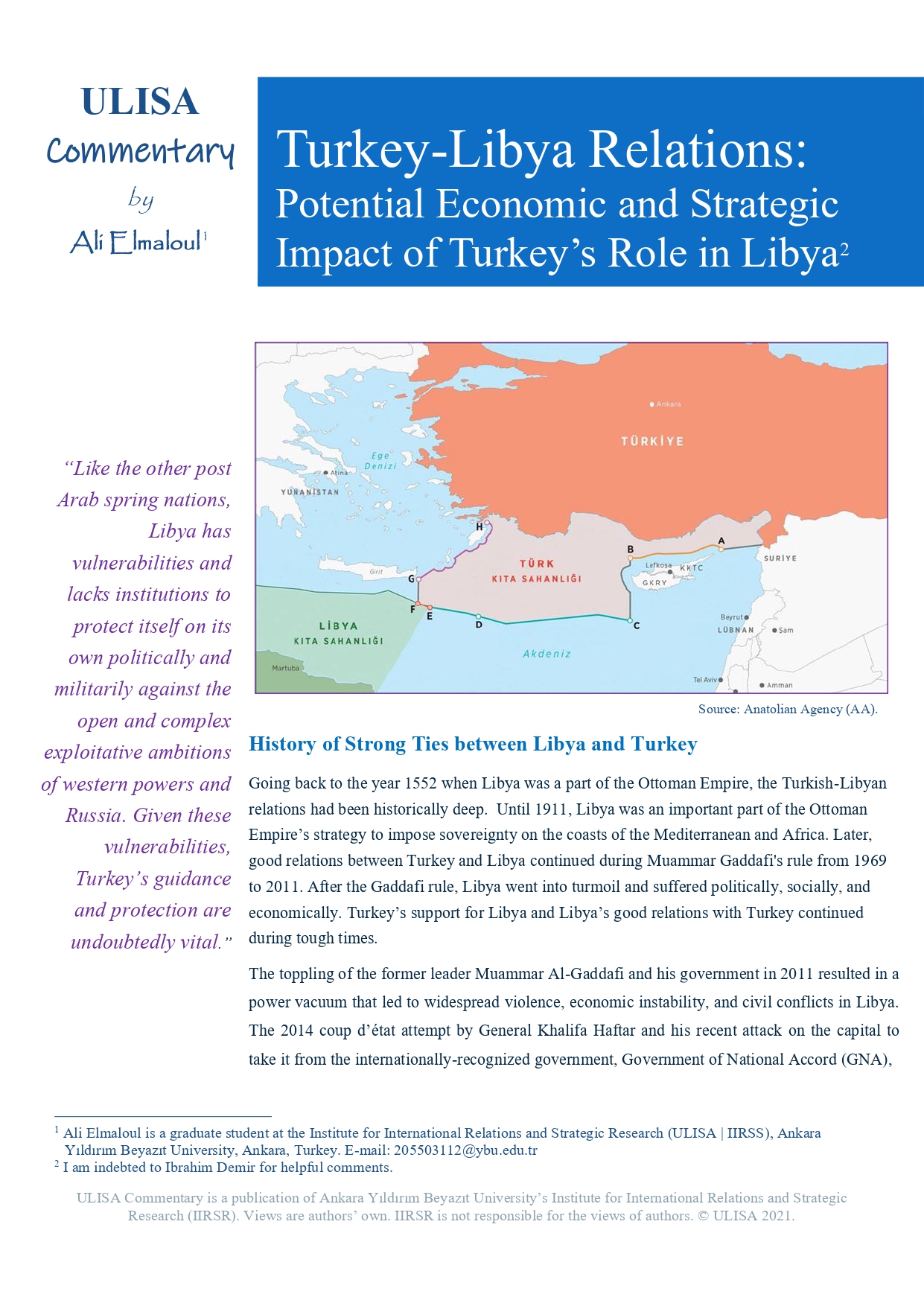 TURKEY-LIBYA RELATIONS: Potential Economic and Strategic Impact of Turkey's Role in Libya