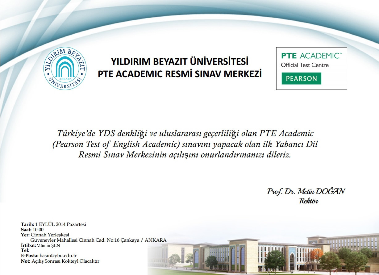 Yıldırım Beyazıt Üniversitesi Türkiye'deki üniversiteler arasında "PEARSON VUE Authorised SELECT Test Centre" olan İLK Üniversite olarak, Pearson Test of English Academic (PTE Academic) sınavını son teknoloji donanıma sahip merkezinde 7 Ağustos 2014 tarihi itibarıyla uygulamaya başlamanın haklı gururunu yaşamaktadır.