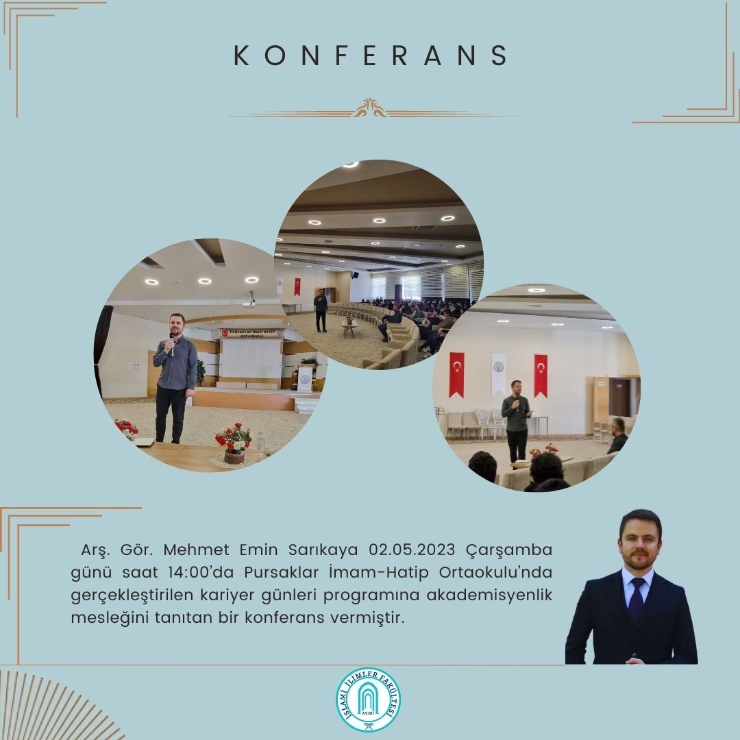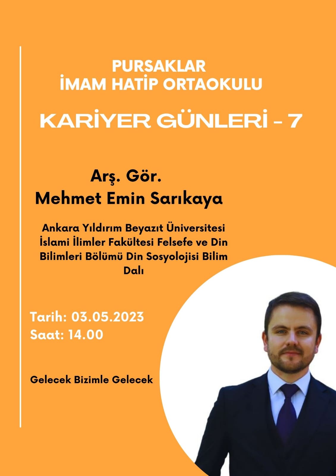 Arş. Gör. Mehmet Emin Sarıkaya 02.05.2023 Çarşamba günü saat 14:00’da Pursaklar İmam-Hatip Ortaokulu’nda gerçekleştirilen kariyer günleri programına akademisyenlik mesleğini tanıtan bir konferans vermiştir.