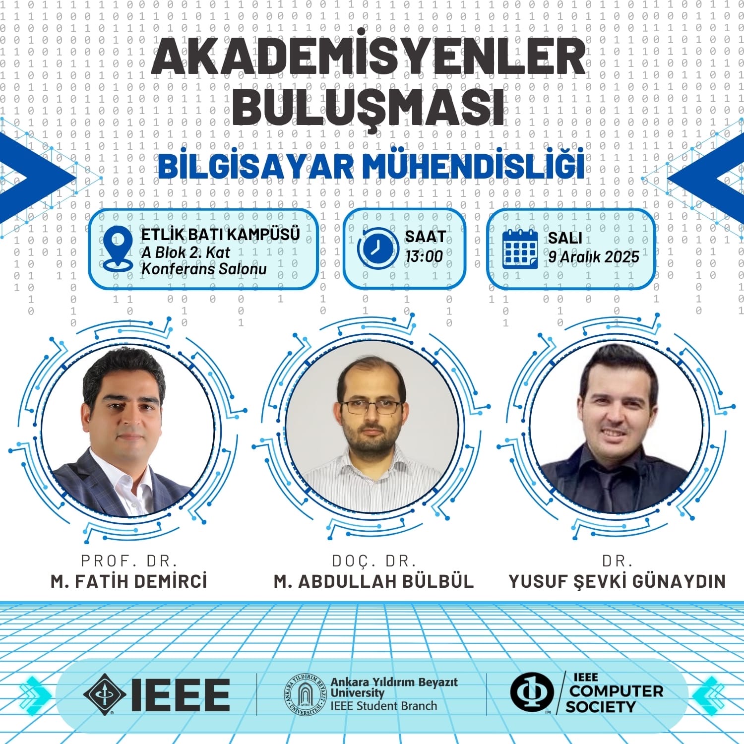 9 Aralık Salı günü saat 13.00’te, IEEE AYBÜ Öğrenci Topluluğu tarafından düzenlenen "Bilgisayar Mühendisliği Akademisyenler Buluşması", Etlik Batı Kampüsü Konferans Salonu'nda gerçekleştirilecek. Etkinlik, öğrencilerin akademisyenlerle bir araya gelerek geleceklerini planlamaları ve ilham almaları açısından önemli bir buluşma olmayı hedefliyor.