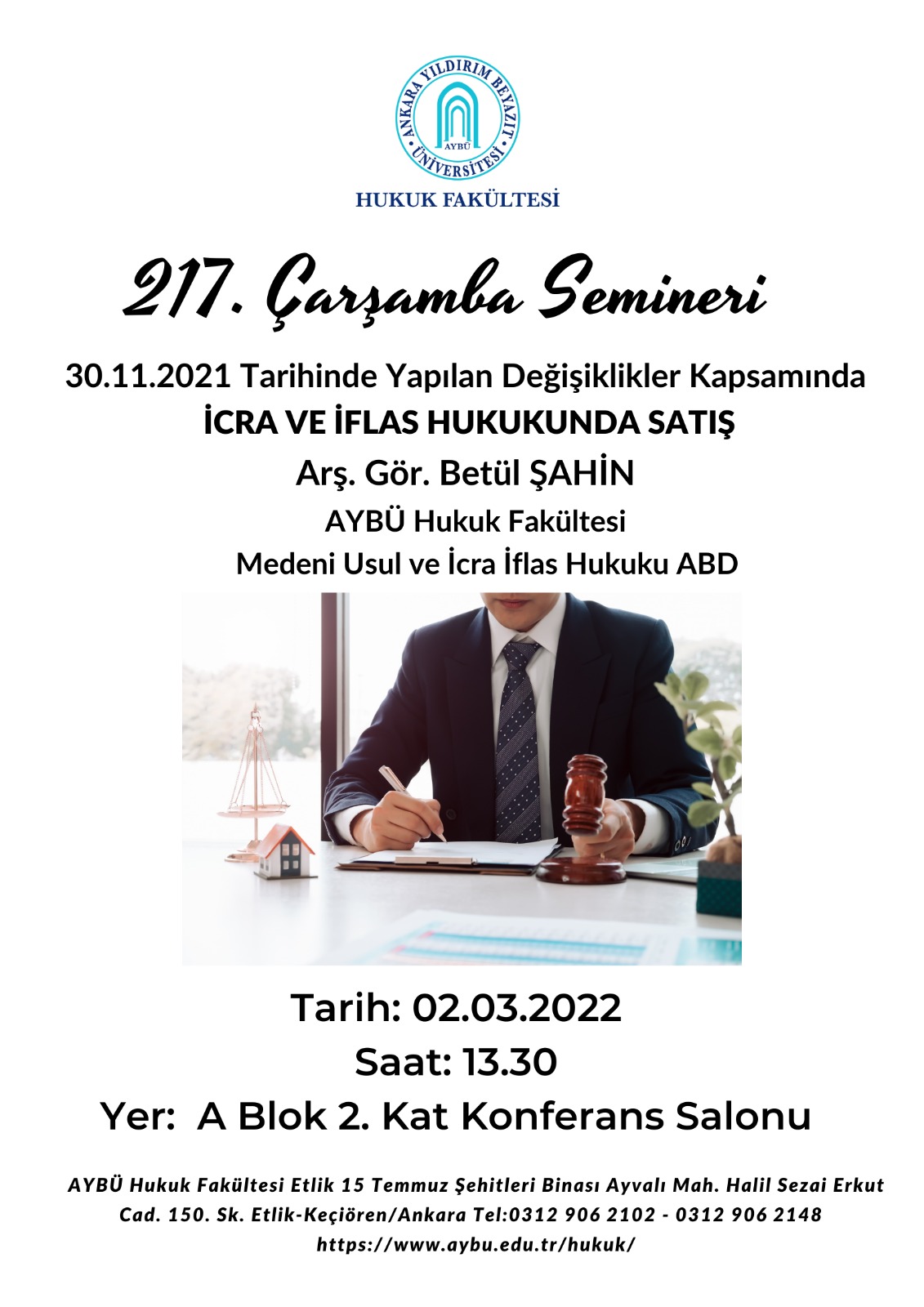 217. Çarşamba Seminerinde Arş. Gör. Betül ŞAHİN tarafından “30.11.2021 Tarihinde Yapılan Değişiklikler Kapsamında İcra ve İflas Hukukunda Satış” başlıklı sunum gerçekleştirilecektir.