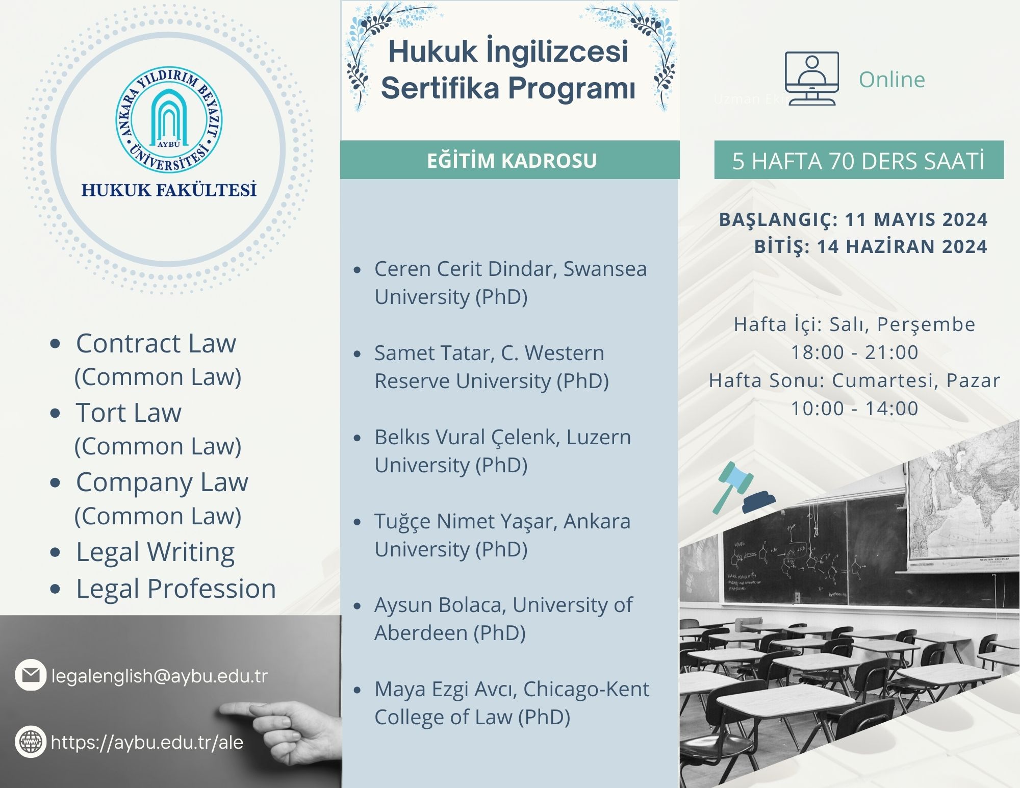 Fakültemizde görev yapmakta olan ve yurtdışında eğitim almış akademisyenler tarafından gerçekleştirilen  Legal English Certificate Program’ın 4. grup dersleri 11 Mayıs - 14 Haziran 2024 tarihleri arasında gerçekleştirilecektir. Programın eğitim süresi 5 haftadır.