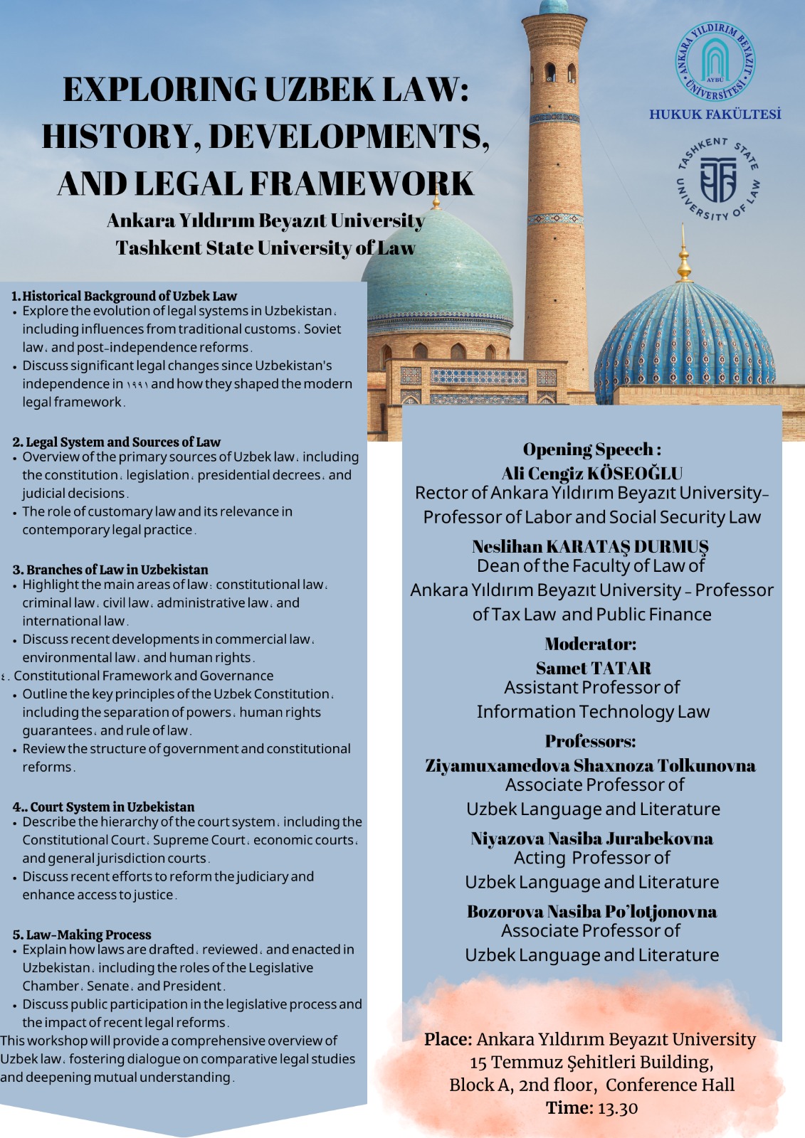 25 Ekim 2024 tarihi saat 13.30’da 15 Temmuz Şehitler Binası A Blok 2. Kat Konferans salonunda Özbekistan Hukuk Sistemi Çalıştayı yapılacaktır.