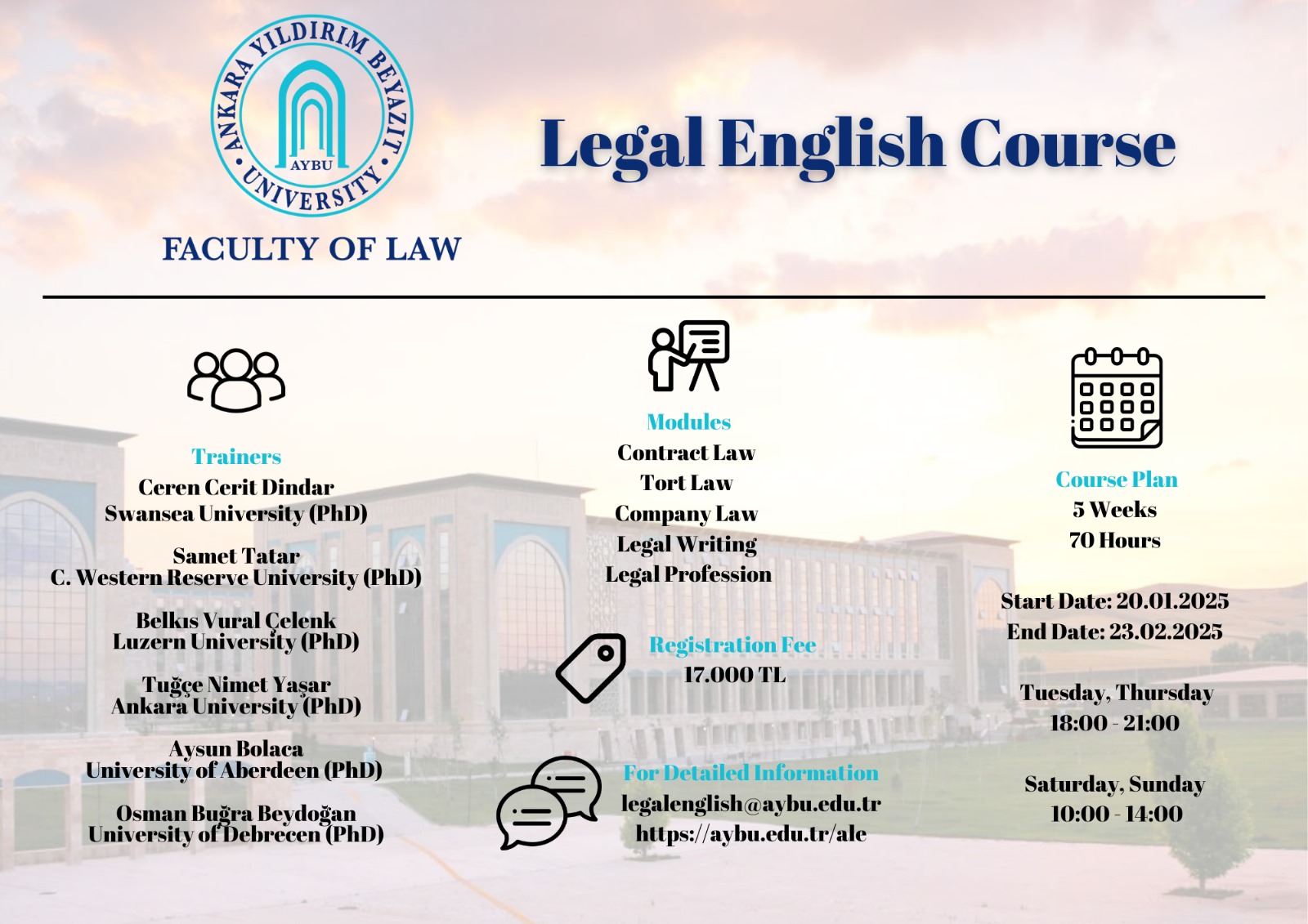 Fakültemizde görev yapmakta olan ve yurtdışında eğitim almış akademisyenler tarafından gerçekleştirilen Legal English Course Program’ın 4. grup dersleri 20 Ocak-23 Şubat 2025 tarihleri arasında, Salı ve Perşembe günleri 18.00-21.00 ile Cumartesi ve Pazar günleri 10.00-14.00 arasında gerçekleştirilecektir. Programın eğitim süresi 5 haftadır.
