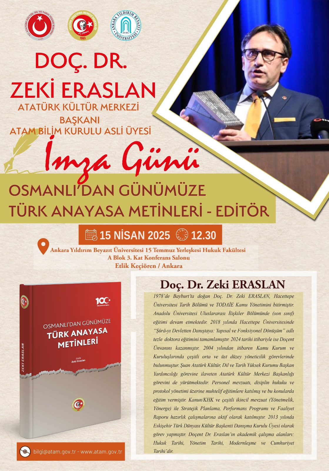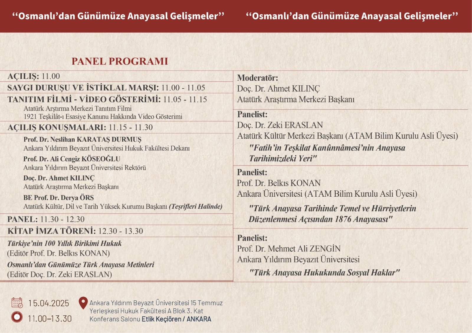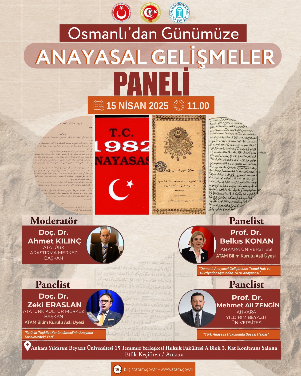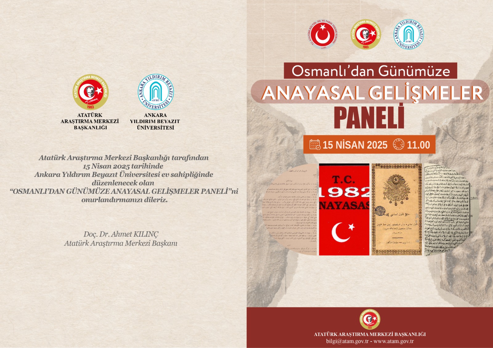 Fakültemiz ev sahipliğinde 15 Nisan 2025 tarihinde Atatürk Araştırma Merkezi Başkanlığınca "Osmanlıdan Günümüze Anayasal Gelişmeler" isimli Panel düzenlenecektir.