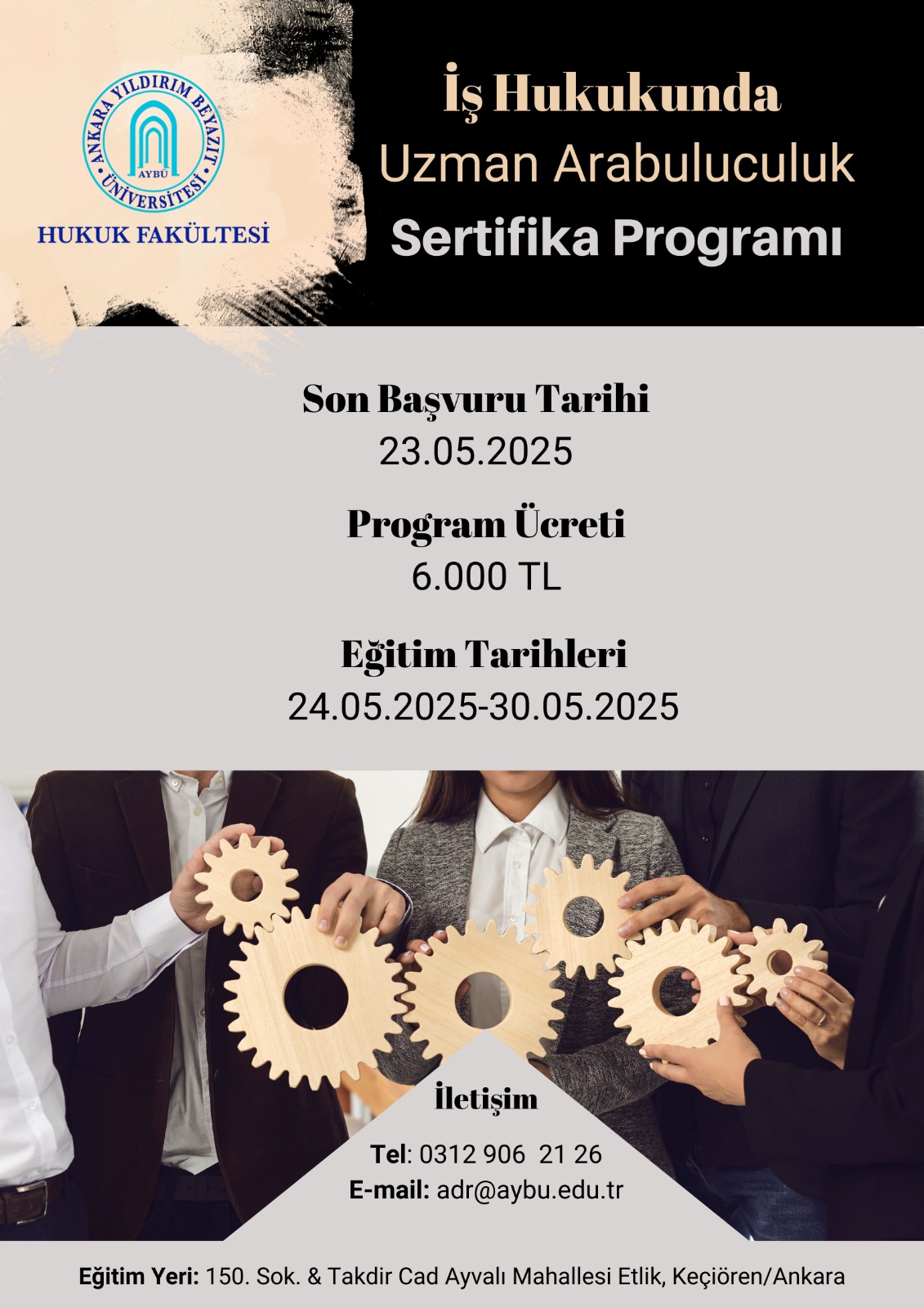 İş Hukukunda Uzman Arabuluculuk Eğitim Programı 24-30 Mayıs 2025 24-30 Mayıs 2025 tarihleri arasında yüz yüze olmak üzere İş Hukukunda Uzman Arabuluculuk Eğitim Programı düzenlenecektir. Program teori ve uygulama olmak üzere toplam 48 saatten oluşmaktadır. Eğitim ücreti 6.000 TL (KDV dâhil) olup, katılımcı sayısı 30 kişi ile sınırlıdır. Programa katılabilmek için arabuluculuk siciline kayıtlı olmak gerekmektedir. Programa katılmak isteyenlerin aşağıda yer alan ön kayıt linkini doldurmaları gerekmekte olup, ön kayıtlar başvuru sırası dikkate alınarak kesinleştirilecektir. Kayıt yaptıranlara, kesin kayıt ve ödeme yapılması için en kısa sürede geri dönüş sağlanacak olup, son başvuru tarihi 23 Mayıs 2025’tir. Bu grubun dolması üzerine ön kayıtlar diğer gruba aktarılacak olup, bu hususta da tarafınıza dönüş yapılacaktır. Başvuru formu için linke tıklayınız.