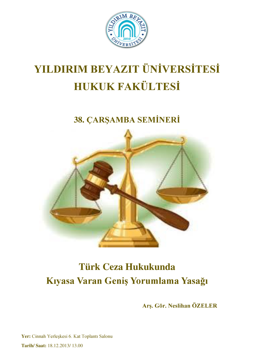 Çarşamba Seminerlerinin 38. haftaki konusu, "Türk Ceza Hukukunda Kıyasa Varan Geniş Yorumlama Yasağı " olacaktır. Üniversitemiz Cinnah kampüsünde yapılacak olan seminere öğretim üyelerimiz, araştırma görevlilerimiz, lisansüstü öğrencilerimiz ile konuya ilgi duyanlar davetlidir.