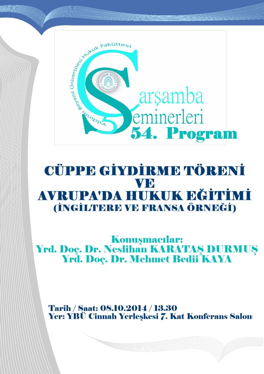 Çarşamba Seminerlerinin 54. haftaki konusu, "Cübbe Giydirme Töreni ve Avrupa'da Hukuk Eğitimi (İngiltere / Fransa Örneği)" olacaktır. Üniversitemiz Cinnah kampüsünde yapılacak olan seminere öğretim üyelerimiz, araştırma görevlilerimiz, lisans ve lisansüstü öğrencilerimiz ile konuya ilgi duyanlar davetlidir.