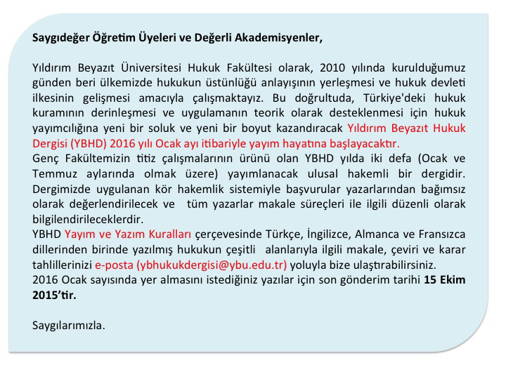 Yıldırım Beyazıt Hukuk Dergisi (YBHD) Makalelerinizi Bekliyor!