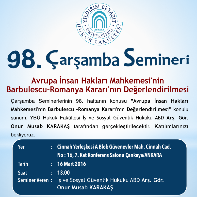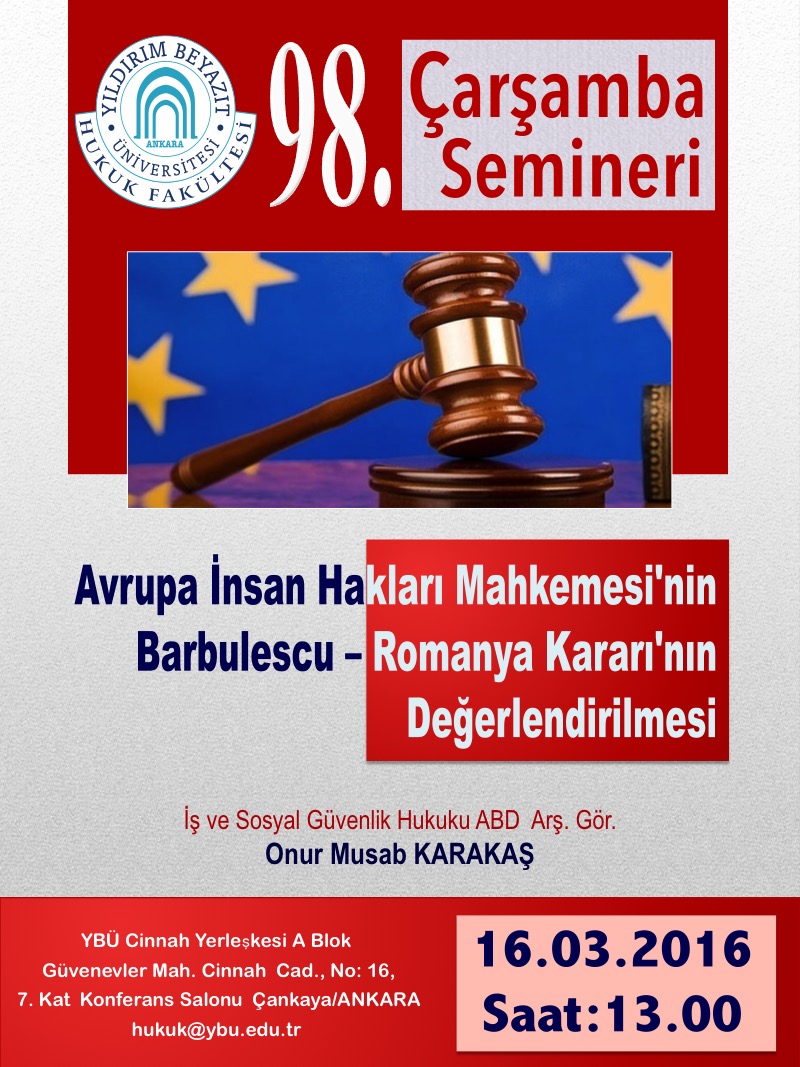 YBÜ Hukuk Fakültesi Çarşamba Semineri 98–Avrupa İnsan Hakları Mahkemesi'nin Barbulescu -Romanya Kararı'nın Değerlendirilmesi