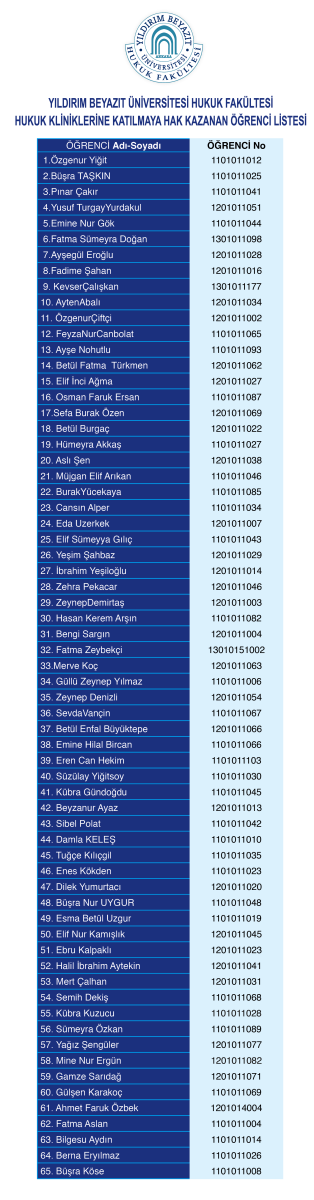 Hukuk Kliniğine katılmaya hak kazanan öğrencilerimizin listesi aşağıdadır. Listede ismi yer alan öğrencilerin klinik faaliyetlerinde görev alabilmeleri amacıyla Birleşmiş Milletler Mülteciler Yüksek Komiserliği tarafından verilecek eğitime katılmaları zorunludur.