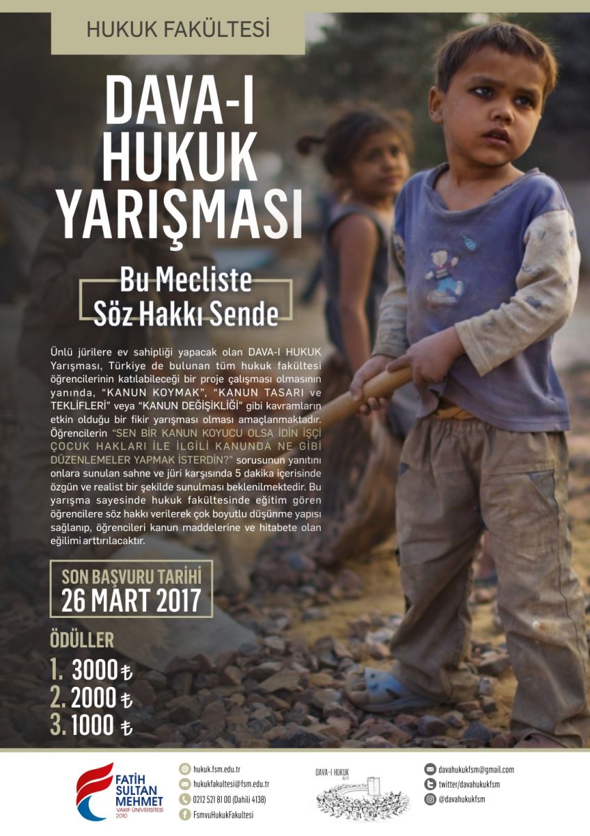 Fatih Sultan Mehmet Vakıf Üniversitesi Hukuk Fakültesi, “İşçi Çocuklar İle İlgili Kanun Değişikliği Önerileri” başlığında Türkiye’deki tüm hukuk fakültesi öğrencilerinin katılabileceği “Dava-ı Hukuk Yarışması” düzenlemektedir.