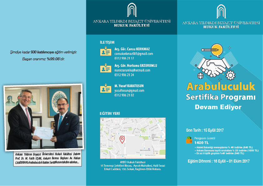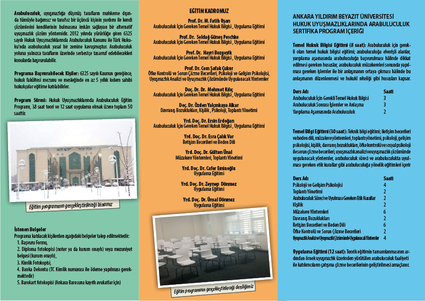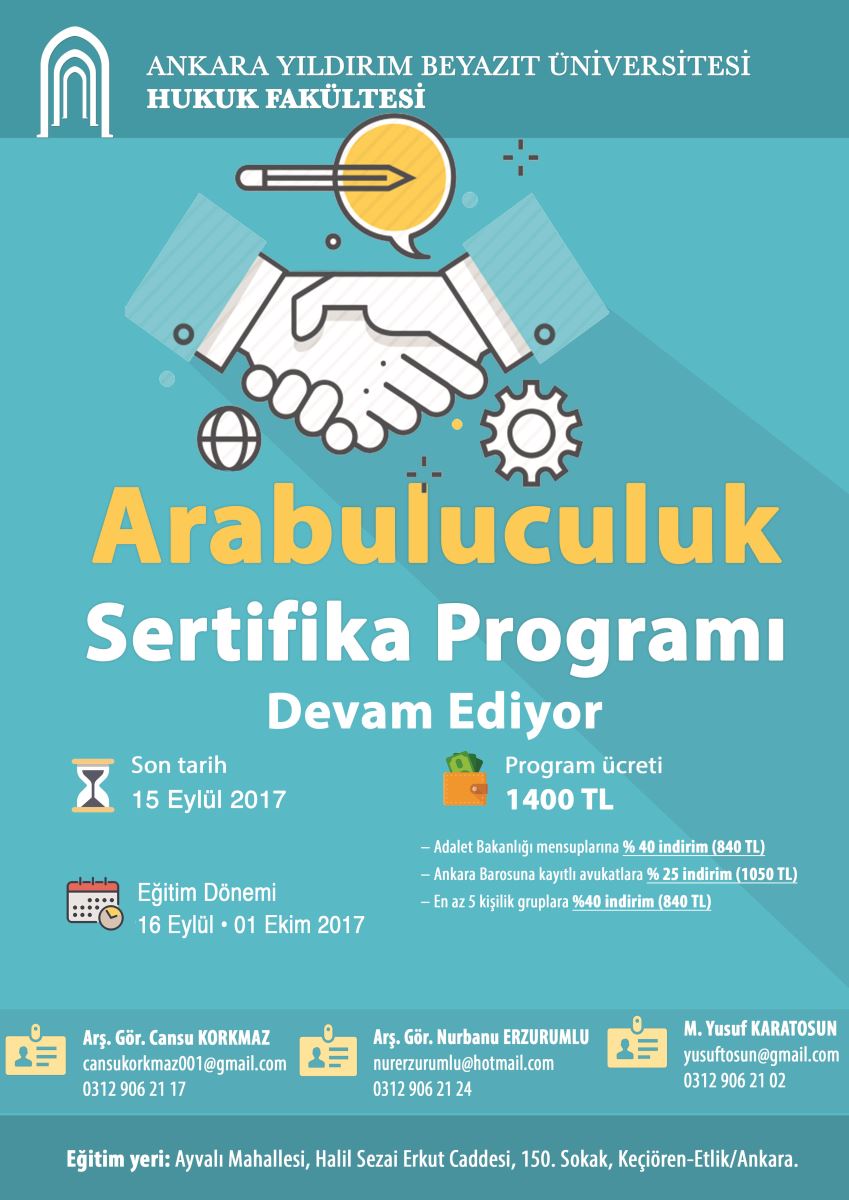 16 Eylül 2017 tarihinde başlayacak olan arabuluculuk sertifika programımız için son başvuru tarihi 15 Eylül 2017'dir. Program ücreti, süresi, kayıt için gerekli belgeler, ders içerikleri, eğitim kadromuz, derslerin yürütüleceği adres gibi ayrıntılı bilgiler için afiş ve broşürümüz inceleyebilirsiniz.