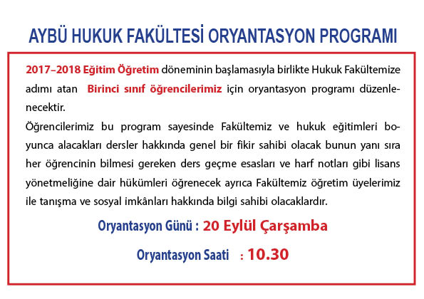 Aybü Hukuk Fakültesi Oryantasyon Programı 20 Eylül Çarşamba Günü Saat 10.30 Yapılacaktır.