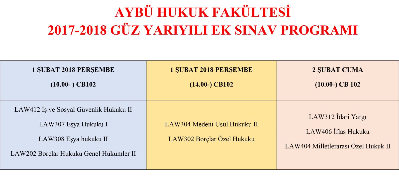 AYBÜ Hukuk Fakültesi 2017–2018 Eğitim Öğretim Yılı Güz Dönemi Ek Sınav Programı