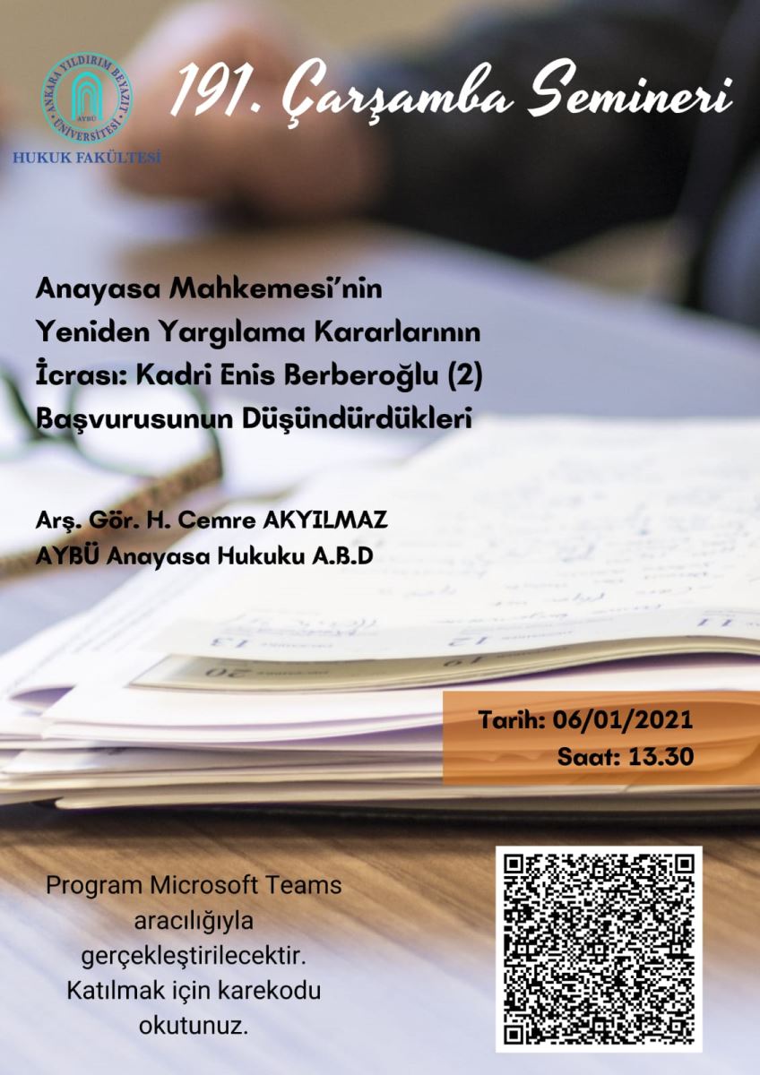 191. Çarşamba Semineri - Anayasa Mahkemesi'nin Yeniden Yargılama Kararlarının İcrası: Kadri Enis Berberoğlu (2) Başvurusunun Düşündürdükleri