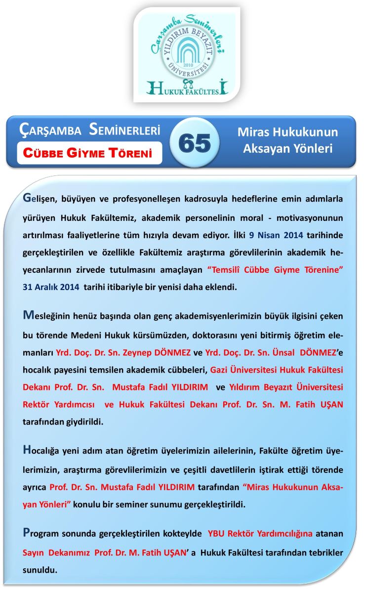 Cübbe Giyme Töreni (Yrd. Doç. Dr. Ünsal Dönmez ve Yrd. Doç. Dr. Zeynep Dönmez) ; Çarşamba Semineri 65 - Miras Hukukunun Aksayan Yönleri