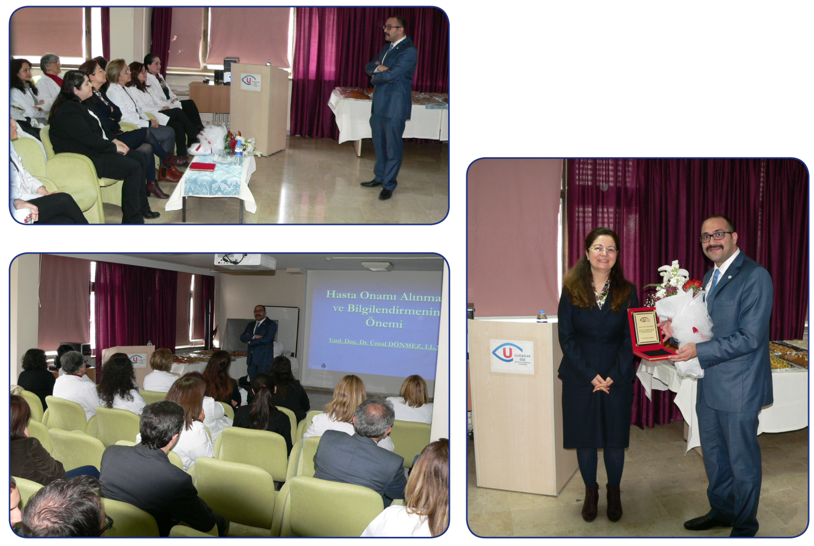 Fakültemiz Öğretim üyelerinden Yrd. Doç Dr. Ünsal Dönmez 14 Mart Tıp Bayramı dolayısıyla Ulucanlar Göz Eğitim ve Araştırma Hastanesi’nde düzenlenen programda Aydınlatılmış Onam” konulu bir sunum yapmıştır. Etkinliğe  Ulucanlar Göz Hastanesi Başhekimi Prof. Dr. Pelin Yılmazbaş ve Başhekim yardımcısı Dr. Gülay Öztürk katılmıştır. Program plaket takdimiyle sona ermiştir.
