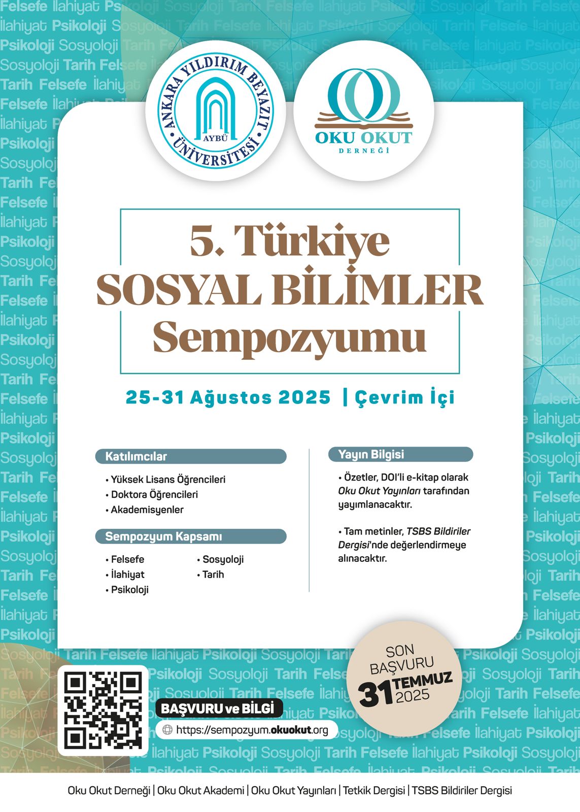 5. Türkiye Sosyal Bilimler Sempozyumu, 25–31 Ağustos 2025 tarihleri arasında çevrim içi ortamda gerçekleştirilecektir. Sempozyum kapsamında, Felsefe, İlahiyat, Psikoloji, Sosyoloji ve Tarih alanlarında hazırlanmış bildiriler sunulabilecektir.