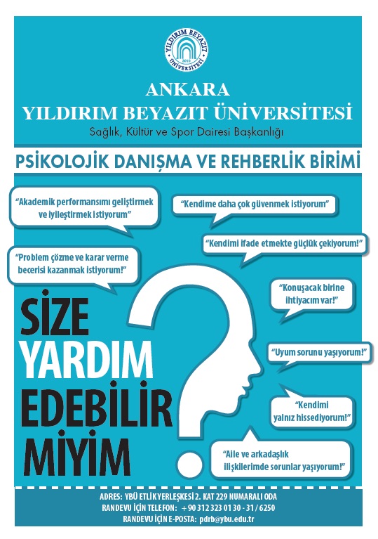 Üniversitemiz ‘PSİKOLOJİK DANIŞMA VE REHBERLİK BİRİMİ’ Etlik Yerleşkemizde hizmet vermektedir. Psikologumuzdan randevu almak için Etlik yerleşkesi 2. Kat 229 numaralı odayı ziyaret edebilir, ‘pdrb@ybu.edu.tr’ e-posta adresine kişisel bilgilerinizi (ad-soyad, telefon, yardım almak istediğiniz konu vb. ) içeren bir e-posta gönderebilir, +90 312 323 01 30 - 31 / 6250 numaralı telefondan birimimize ulaşabilirsiniz.