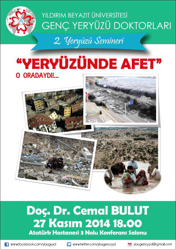 Üniversitemiz Multidisipliner Araştırma Topluluğu ve Genç Yeryüzü Doktorları Kulübü'nün 27 Kasım Perşembe saat 18.00 da Atatürk Eğitim Araştırma Hastanesi 3 nolu Konferans Salonunda "yeryüzünde afet" konulu toplantısı olacaktır. Tüm öğrenci ve öğretim Üyelerimiz davetlidir.