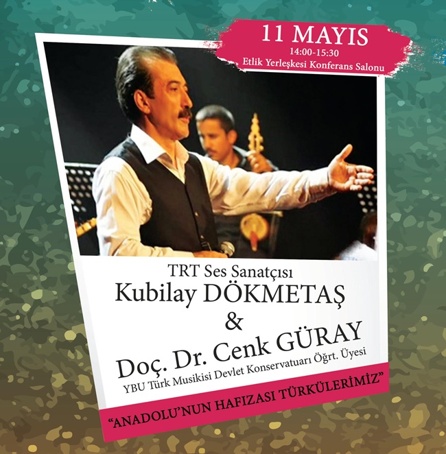 Üniversitemiz Etlik Yerleşkesinde TRT Ses Sanatçısı Kubilay DÖKMETAŞ ve Üniversitemiz Türk Musikisi Devlet Konservatuvarı Öğretim Üyesi Doç.Dr. Cenk GÜRAY'ın katılımıyla "Anadolu'nun Hafızası Türkülerimiz" programı 11 Mayıs 2016 Çarşamba günü saat 14:00/15:30 da gerçekleştirilecektir.