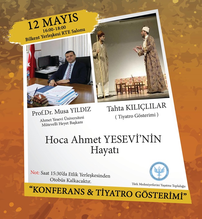 Birleşmiş Milletler Eğitim, Bilim ve Kültür Teşkilatı (UNESCO) tarafından 2016 yılı Hoca Ahmet Yesevi Hazretlerinin vefatının 850. yıl dönümü nedeniyle "UNESCO 2016 Hoca Ahmet Yesevi Yılı" olarak kabul edilmiştir. Buna bağlı olarak Üniversitemiz Bilkent Yerleşkesinde Türk Kazak Ahmet Yesevi Üniversitesi Mütevelli Heyeti Başkanı Sayın Prof. Dr. Musa Yıldız hocamızın açılış konuşmalarının ardından Hoca Ahmet Yesevi Hazretlerini anlatan tiyatro gösterimi "Tahta Kılıçlılar" programı 12 Mayıs 2016 Perşembe günü saat 16:00/18:00 de gerçekleştirilecektir.