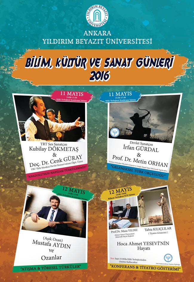 16:00-18:00 Birleşmiş Milletler Eğitim, Bilim ve Kültür Teşkilatı (UNESCO) tarafından 2016 yılı Hoca Ahmet Yesevi Hazretlerinin vefatının 850. yıl dönümü nedeniyle "UNESCO 2016 Hoca Ahmet Yesevi Yılı" olarak kabul edilmiştir. Buna bağlı olarak Üniversitemiz Bilkent Yerleşkesinde Türk Kazak Ahmet Yesevi Üniversitesi Mütevelli Heyeti Başkanı Sayın Prof. Dr. Musa Yıldız hocamızın açılış konuşmalarının ardından Hoca Ahmet Yesevi Hazretlerini anlatan tiyatro gösterimi "Tahta Kılıçlar" programı 12 Mayıs 2016 Perşembe günü saat 16:00/18:00 de gerçekleştirilecektir.