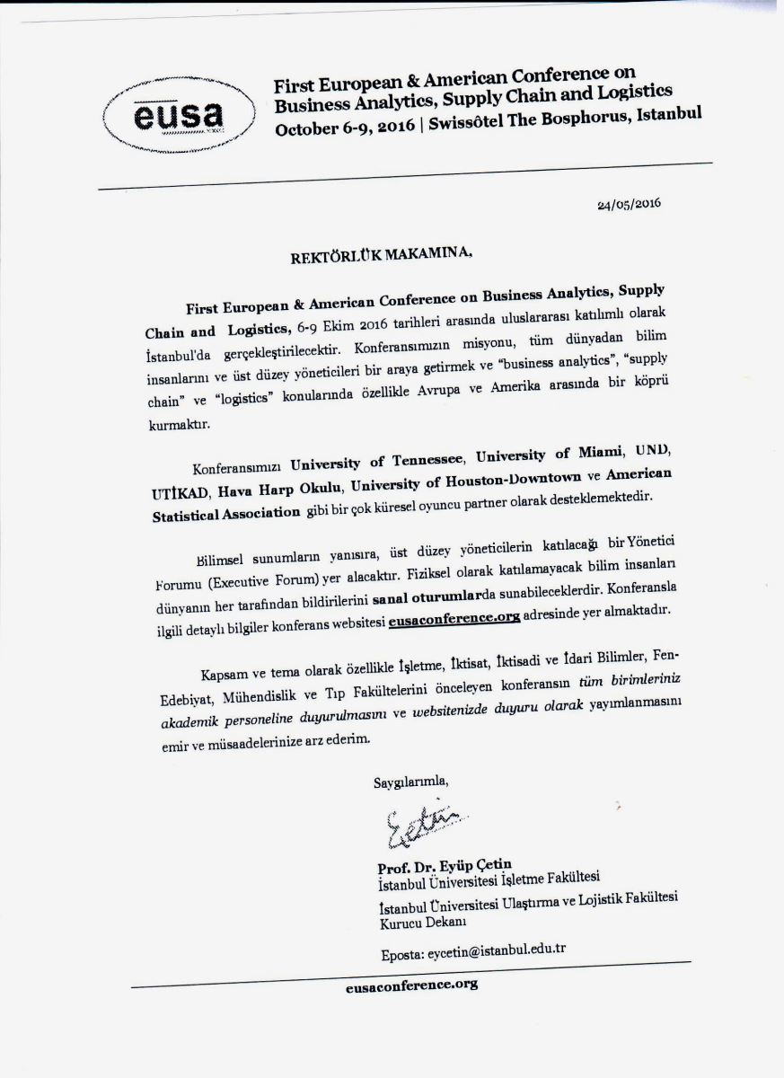 First European & American Conference on Business Analytics Supply Chain and Logistics October 6-9, 2016 Swissotel,The Bosphorous, İstanbul