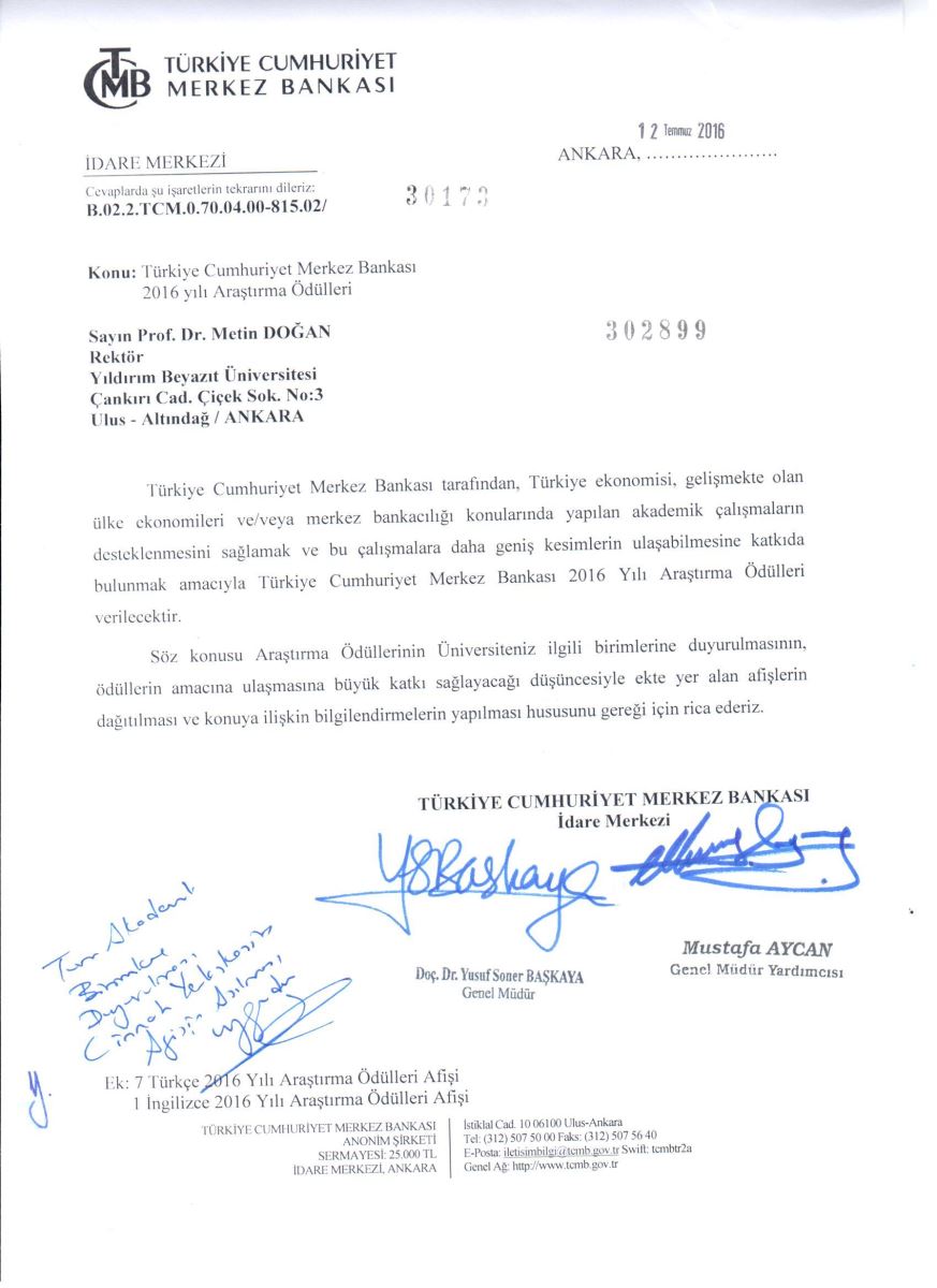 Türkiye Cumhuriyeti Merkez Bankası 2016 Yılı Araştırma Ödülleri Duyurusu