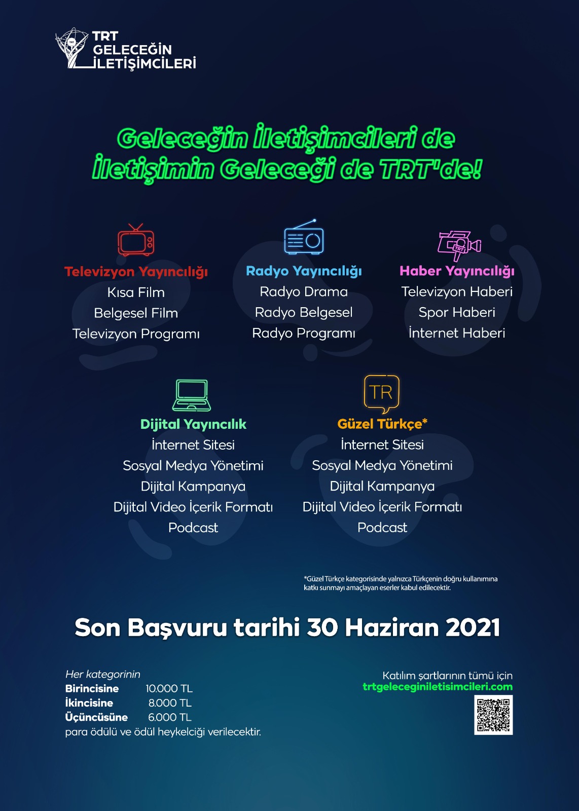 Bu doğrultuda her yıl düzenlediğimiz TRT Geleceğin İletişimcileri Yarışması’nın 2021 başvuru süreci 15 Şubat itibariyle başladı. Radyo Yayıncılığı, Televizyon Yayıncılığı, Haber Yayıncılığı ve Dijital Yayıncılık ana kategorilerinde gerçekleştirilen yarışmaya ilişkin detaylı bilgi ve katılım şartlarına www.trtgeleceginiletisimcileri.com adresinden ulaşılabilir.