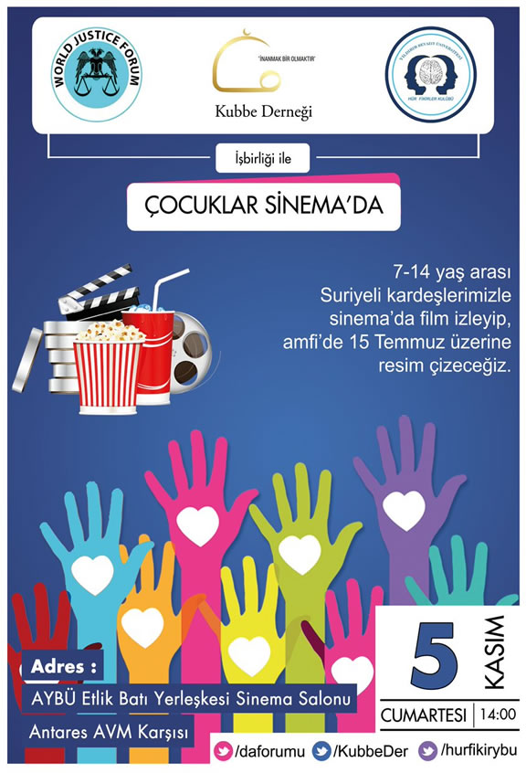 Üniversitemiz Hür Fikirler Öğrenci Kulübü organizasyonunda World Justice Forum ile Kubbe Derneği işbirliğinde Etlik Batı Yerleşkemizde 05 Kasım 2016 saat 14:00'de,  7-14 yaş arası Suriyeli çocuklara özel program gerçekleştirilecektir.