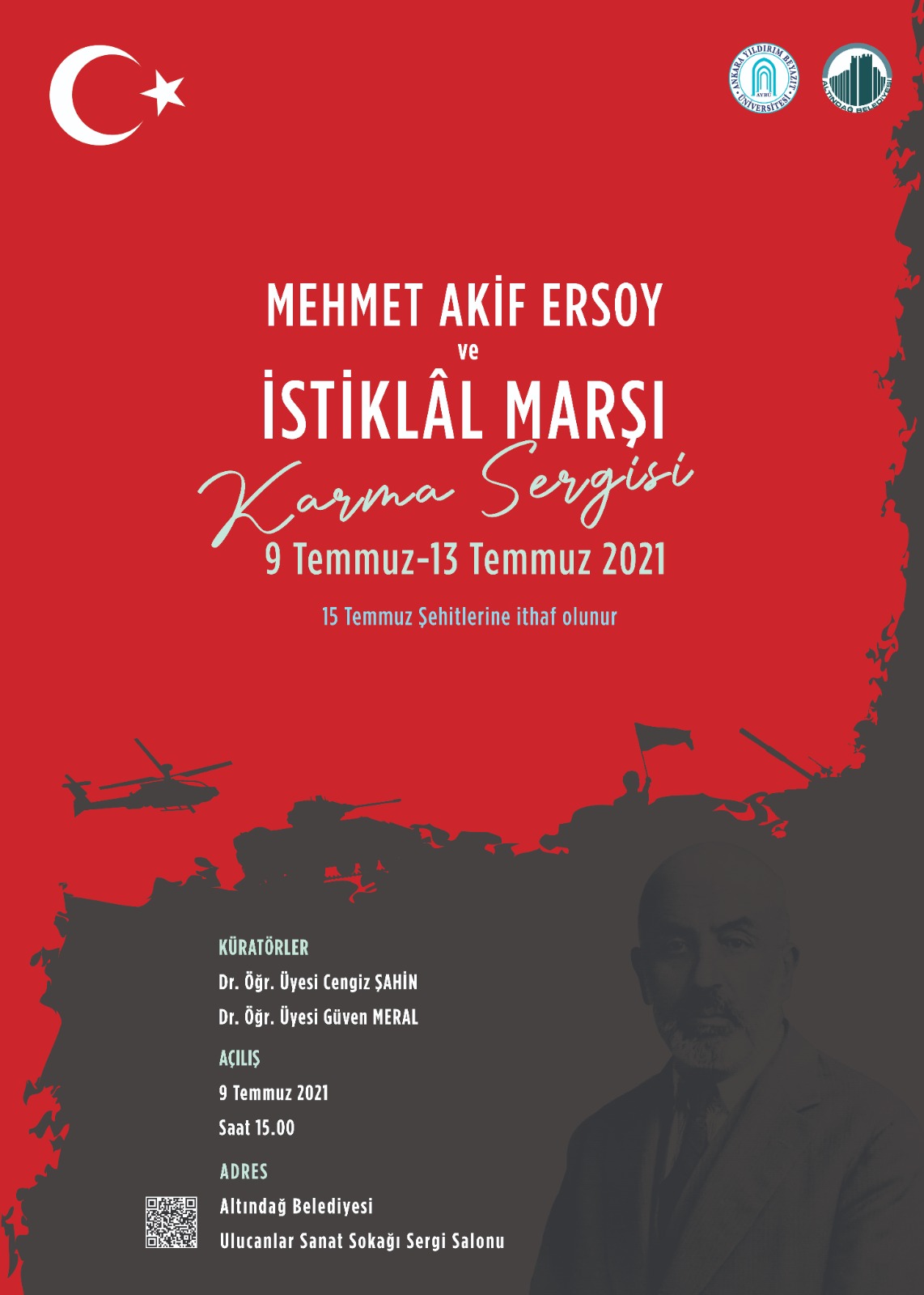 15 Temmuz Şehitleri anısına ithafen Üniversitemiz Mimarlık ve Güzel Sanatlar Fakültesi Görsel İletişim Tasarımı Bölümü tarafından düzenlenen küratörlüğünü Bölüm öğretim üyeleri Dr. Öğr. Üyesi Cengiz ŞAHİN ve Dr. Öğr. Üyesi Güven MERAL'in yaptığı "Mehmet Akif Ersoy ve İstiklal Marşı" Temalı Davetli Karma Serginin Ulucanlar Sanat Sokağı Sergi Salonundaki 9 Temmuz 2021 Cuma günü saat 15.00'teki açılışını onurlandırmanızı dileriz.