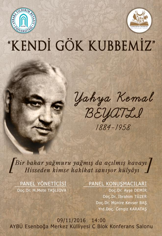 Üniversitemiz Genç Edebiyatçılar Öğrenci Topluluğu organizasyonunda öğretim üyelerimizden Doç. Dr. Mete Taşlıova, Doç.Dr. İbrahim Tüzer, Doç. Dr. Ayşe Demir, Yrd. Doç. Dr. Cengiz Karataş'ın konuşmacı olarak katılacağı Yahya Kemal Beyatlı Paneli 9 Kasım 2016 saat 14:00'te Esenboğa Külliyemiz C Blok Konferans Salonu'nda gerçekleştirilecektir.