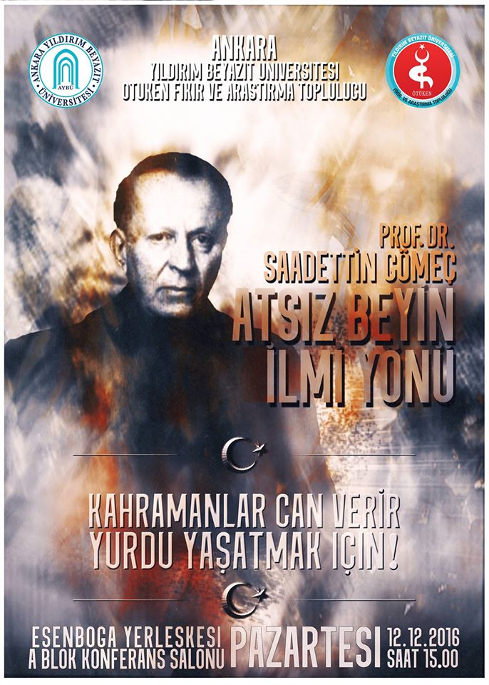 Üniversitemiz Ötüken Fikir ve Araştırma Öğrenci Topluluğu organizasyonunda Ankara Üniversitesi Dil ve Tarih Coğrafya Fakültesi Öğretim Üyesi Prof. Dr. Saadettin Yağmur Gömeç'in konuşmacı olarak katılacağı "Atsız Beyin İlmi Yönü" konulu panel gerçekleştirilecektir.