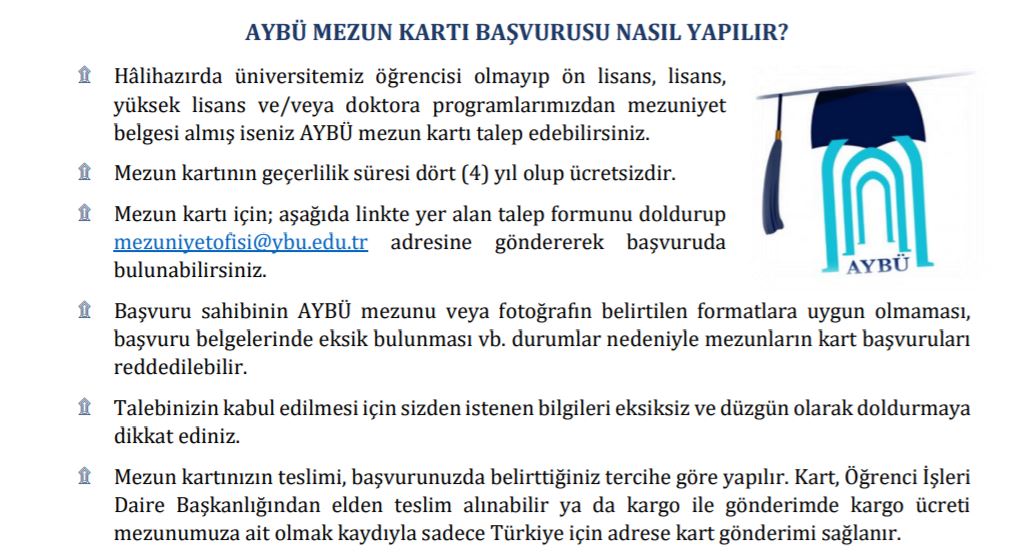 AYBÜ yönetimi olarak mensuplarımıza katkı sağlayacağına inandığımız çalışmalarla yeni adımlar atıyoruz. Bu kapsamda, uzun süredir talep edilen mezun kartımızın basımına ve dağıtımına başlıyoruz. Mezunlarımızla dayanışma içinde bağımızı sağlamlaştırarak güvenle büyüyen ve her zaman birliği amaçlayan bir AYBÜ ailesi olacağımıza inanıyoruz. Mezuniyeti son değil, yaşam boyu devam edecek “AYBÜ Ailesi Üyeliği” için yeni bir başlangıç olarak görüyoruz. Bu noktada sizlerle bağlarımızı kuvvetlendirmek, iletişimi artırmak ve aidiyet duygusunu güçlendirmek için AYBÜ mezun kartı tasarladık. Üniversitemizde hâlihazırda aktif öğrenciliği bulunmayan, üniversitemizin ön lisans, lisans, yüksek lisans ve/veya doktora mezunlarına sağlanacak “AYBÜ Mezun Kartı” ile mezunlarımız hem üyesi olduğu AYBÜ ailemizi hatırlayacak hem de kendilerine sunulan ve aşağıda sıralanan çeşitli avantajlardan yararlanabilecektir. Kartın kapsamı, zaman içinde geliştirildikçe AYBÜ web sayfasında ilan edilecektir.