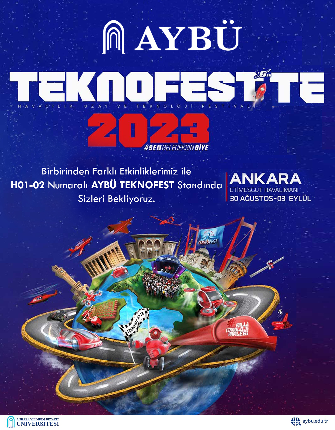 Paydaşı olduğumuz TEKNOFEST’te birbirinden farklı etkinliklerimizle H01-02 numaralı #AYBÜ standına sizleri bekliyoruz.
