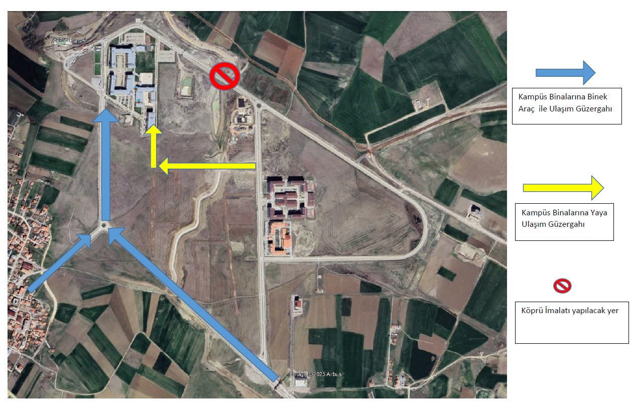 Üniversitemiz Esenboğa Külliyesi Kampüs içerisinde gerçekleştirilecek köprü imalatına 26.03.2025 tarihi itibarıyla başlanacak olup kapanacak yol güzergahına alternatif olarak sunulan yol güzergahları uydu görüntüsünde belirtilmiştir.