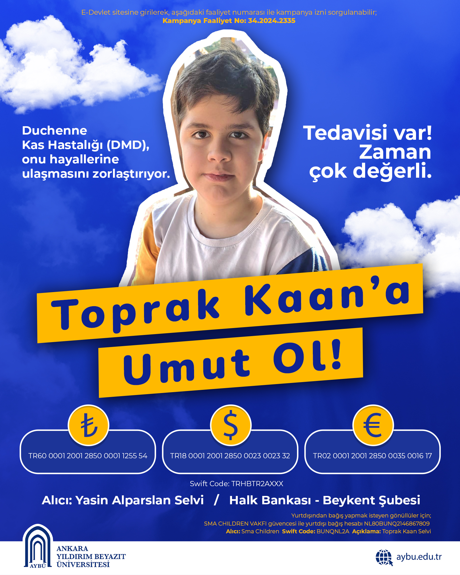 Üniversitemiz personeli yakını, DMD (Duchenne Musküler Distrofi) tanısı olan 16.04.2015 doğumlu Toprak Kaan SELVİ'nin tedavi masraflarının karşılanabilmesi için Üniversitemiz personelinin desteğine ihtiyaç duyulmaktadır.