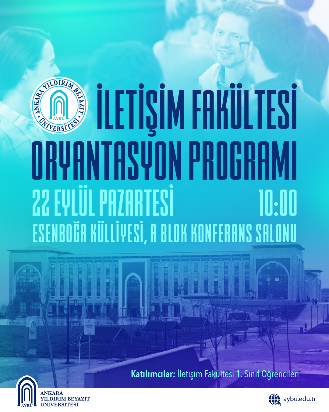 2025-2026 Eğitim-Öğretim Yılında İletişim Fakültemizde öğrenim görmeye başlayacak Halkla İlişkiler ve Reklamcılık Bölümü ile Yeni Medya ve İletişim Bölümümüz 1.Sınıf Öğrencilerimize yönelik 22 Eylül 2025 Pazartesi günü saat 10:00-12:00 arasında Esenboğa Külliyesi A Blok Zemin Kat Konferans Salonunda oryantasyon programı düzenlenecektir.