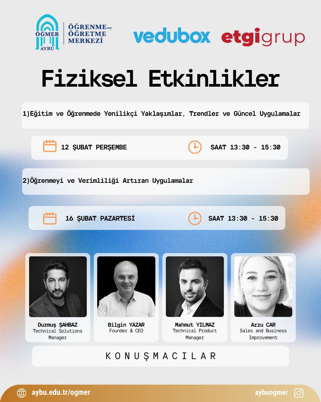 Online etkinliklere ilişkin katılım bağlantıları ayrıca duyurulacaktır.. https://aybu.edu.tr/ogmer