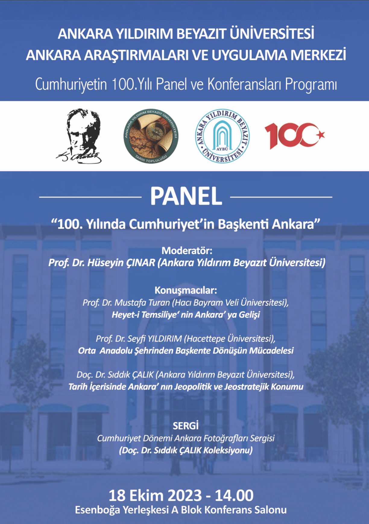 "100. yılında Cumhuriyet'in Başkenti Ankara" temalı panel, Prof. Dr. Hüseyin ÇINAR moderatörlüğünde, 18 Ekim 2023 tarihinde saat 14.00'te Esenboğa Yerleşkesi A Blok Konferans Salonunda gerçekleşecektir.