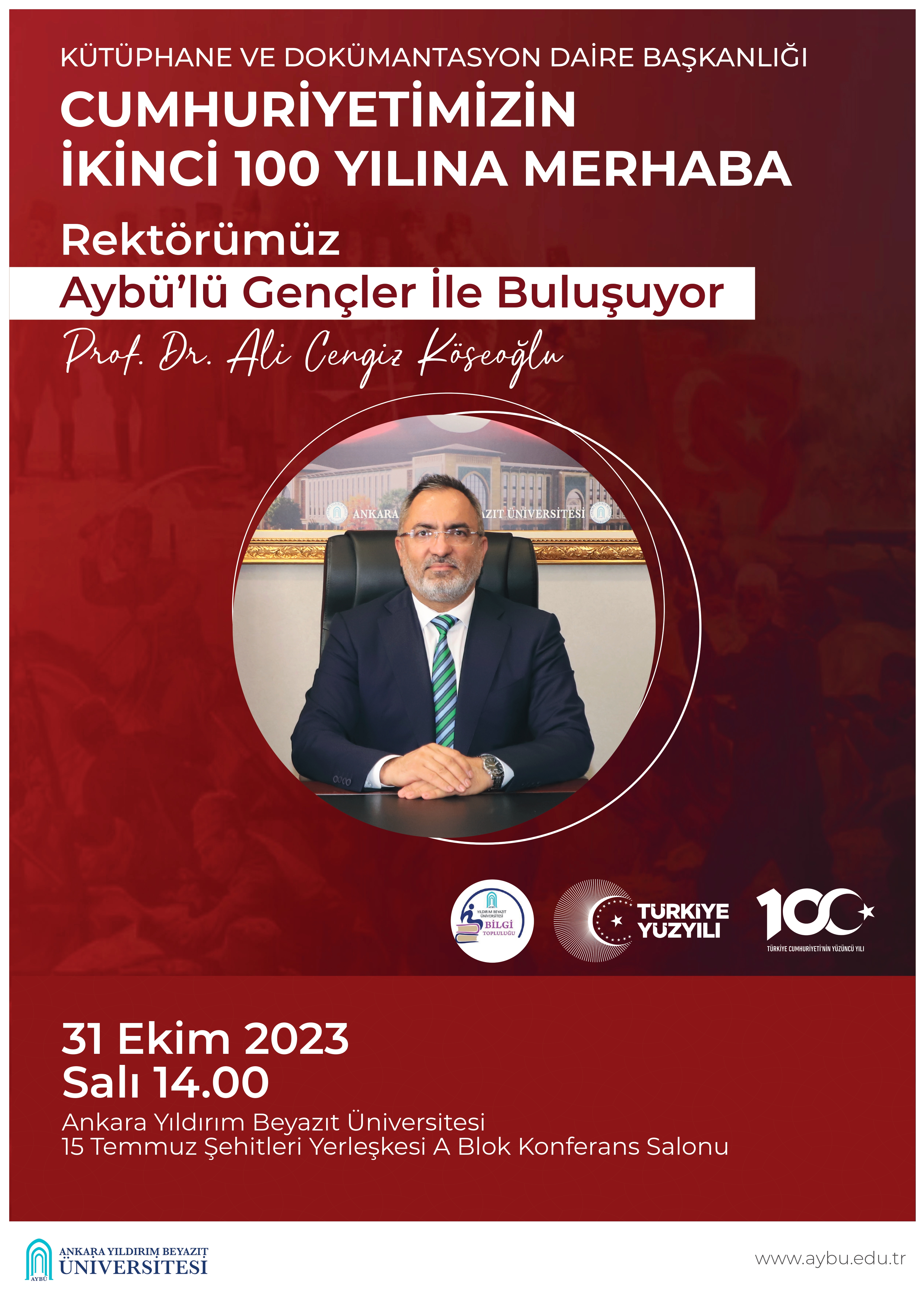 AYBÜ Kütüphane ve Dokümantasyon Daire Başkanlığı tarafından düzenlenen Cumhuriyetimizin İkinci Yüzyılına Merhaba programında, Rektörümüz Prof. Dr. Ali Cengiz KÖSEOĞLU Aybü'lü Gençler İle Buluşacak.