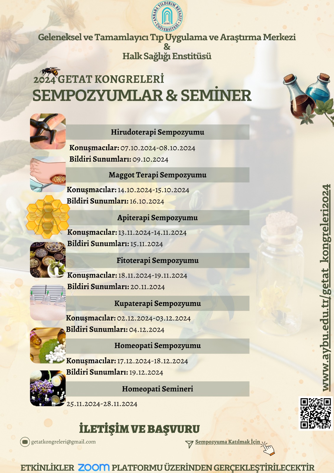 Üniversitemiz Geleneksel ve Tamamlayıcı Tıp Araştırma ve Uygulama Merkezi ile Halk Sağlığı Enstitüsü işbirliğiyle düzenlenen Sempozyum Dizisine ve Seminer’e sizleri davet etmekten mutluluk duyarız. Sempozyumlar ve seminer, geleneksel tıbbın çeşitli alanlarında uzman profesyonellerin ve akademisyenlerin katılımıyla çevrimiçi olarak ZOOM Platformu üzerinden gerçekleştirilecektir. Sempozyumlar kapsamında ilk iki gün alanında uzman profesyoneller ve akademisyenler konuşmalarını gerçekleştirecek. Üçüncü gün ise bildiri sunumları ile sempozyumlar sonlandırılacaktır. Geleneksek ve tamamlayıcı tıp alanlarında temel ve güncel konularının paylaşılacağı, klinik uygulayıcıların deneyimlerini aktaracağı ve önümüzdeki yıllardaki klinik uygulamalarımıza ve bilimsel çalışmalarımıza yön verecek bir etkinlik olmasını planlıyoruz.