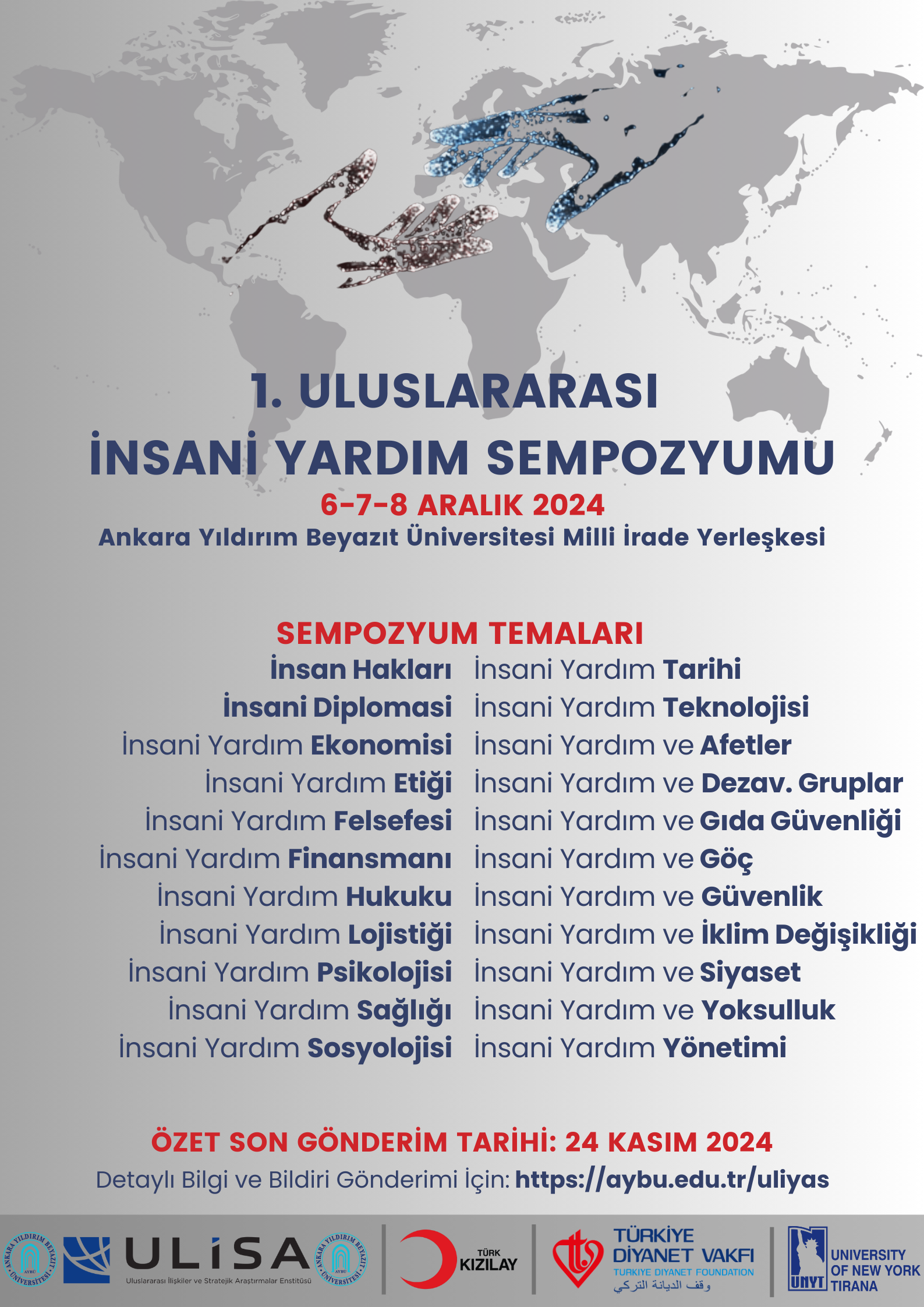" Ankara Yıldırım Beyazıt University (AYBU) Institute for International Relations and Strategic Research (ULISA-IIRSR) will host the I. International Humanitarian Aid Symposium (ULIYAS) during 6-7-8 December 2024 in partnership with the Turkish Red Crescent, Türkiye Diyanet Foundation and University of New York Tirana. The selected papers submitted on December 15, 2024, will be published in the Humanitarian Aid Special Issue of Ulisa: Journal of International Studies. Papers submitted by the full-text deadline of December 20 that are not published in the journal will be included in the full-text proceedings book.